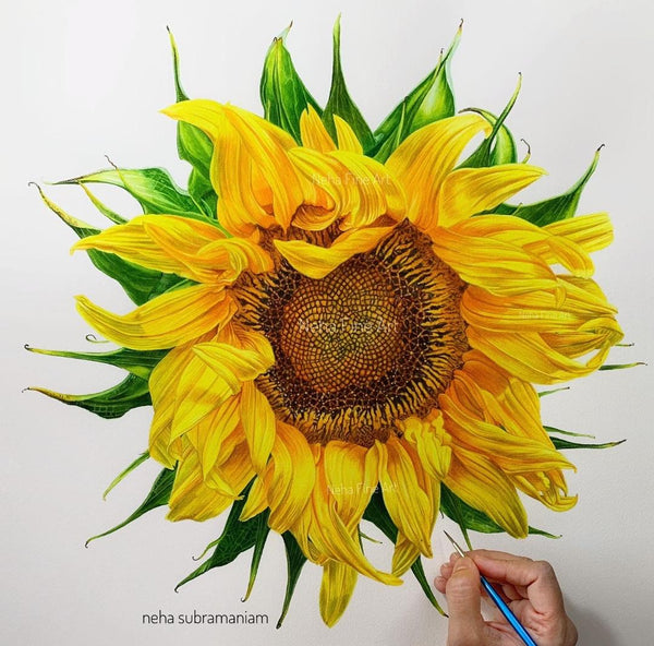 An amazing thing about art is the variety. As I scroll through the artists I follow on Instagram I am amazed at the different procedures, products, tools, and processes that I see. For abstract art, the sky is the limit. But recently I was stopped mid-scroll by a pink hydrangea that was photographed unfinished. I could not stop looking at it so, of course, I looked at the artists’ other works. A sunflower, a rose (also pink), a horse and a dog. The only word I can think of is: stunning! I reached out to the artist to learn more about these incredible watercolors. And that is how I met Neha.