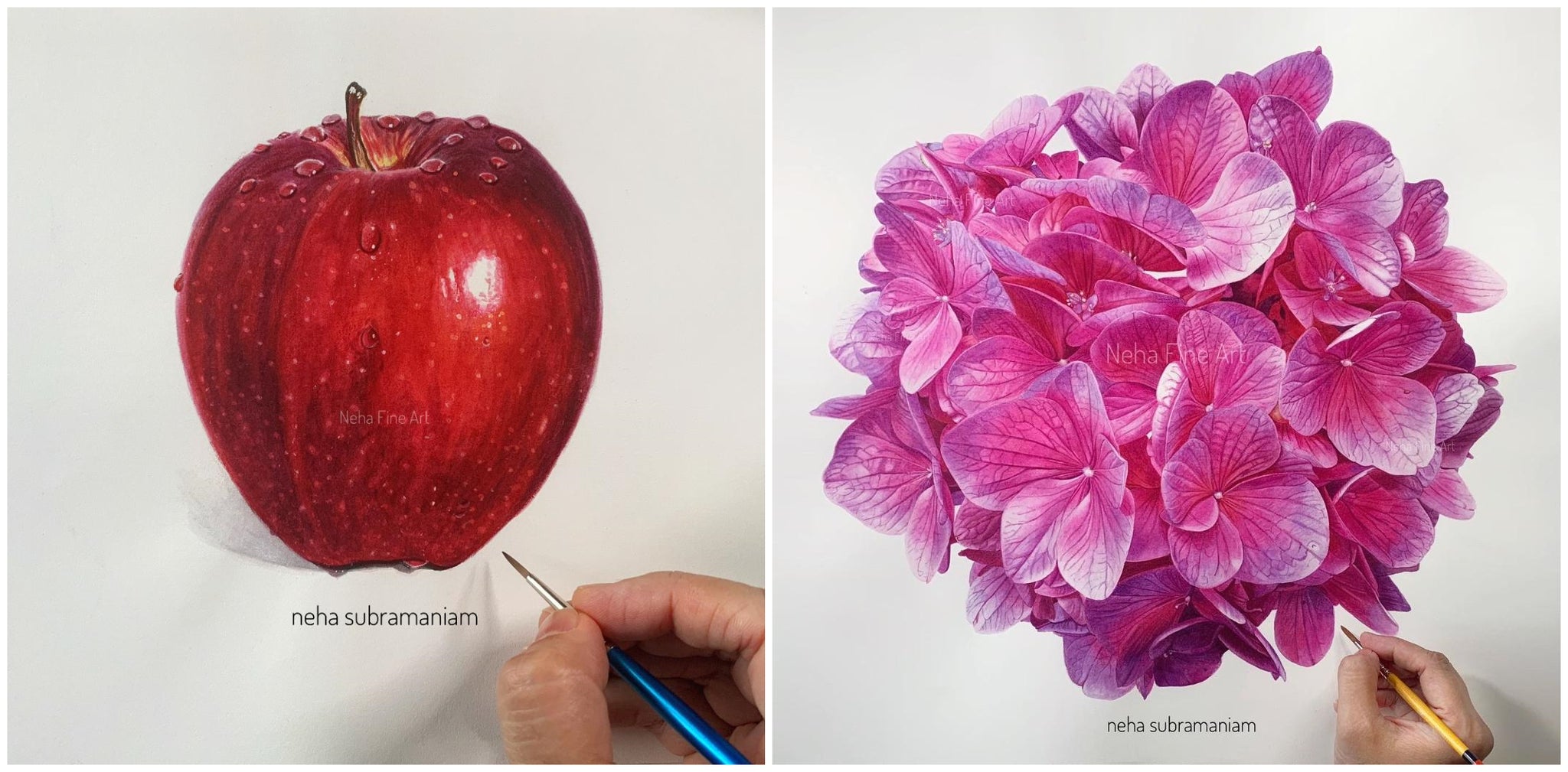 You can see immediately as you look at her work, she loves the fresh look of realism in her paintings. As she puts it, “I like to put myself into my paintings”. Neha likes the challenge of small details. The video on her IG (artist_neha.s) of painting the rose blows me away. Each line, every small shade difference is well thought out. She tells me that the way watercolors mix on the paper amazes her. That is why she enjoys using watercolors. She adds colors that the typical person would not see. I fall into that category (the typical person). I look closely at the rose painting which looks like pinks and whites. Maybe 5 shades of pink? Neha laughs and says there is violet in there along with some orange and yellow. How can you count the shades of color in a painting. Every time the brush touches the paper it is laying down a different shade depending on what was just added and what was already there. This is what draws Neha to watercolors now.