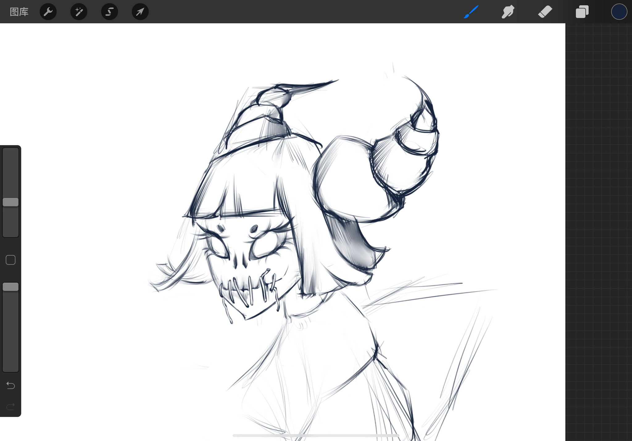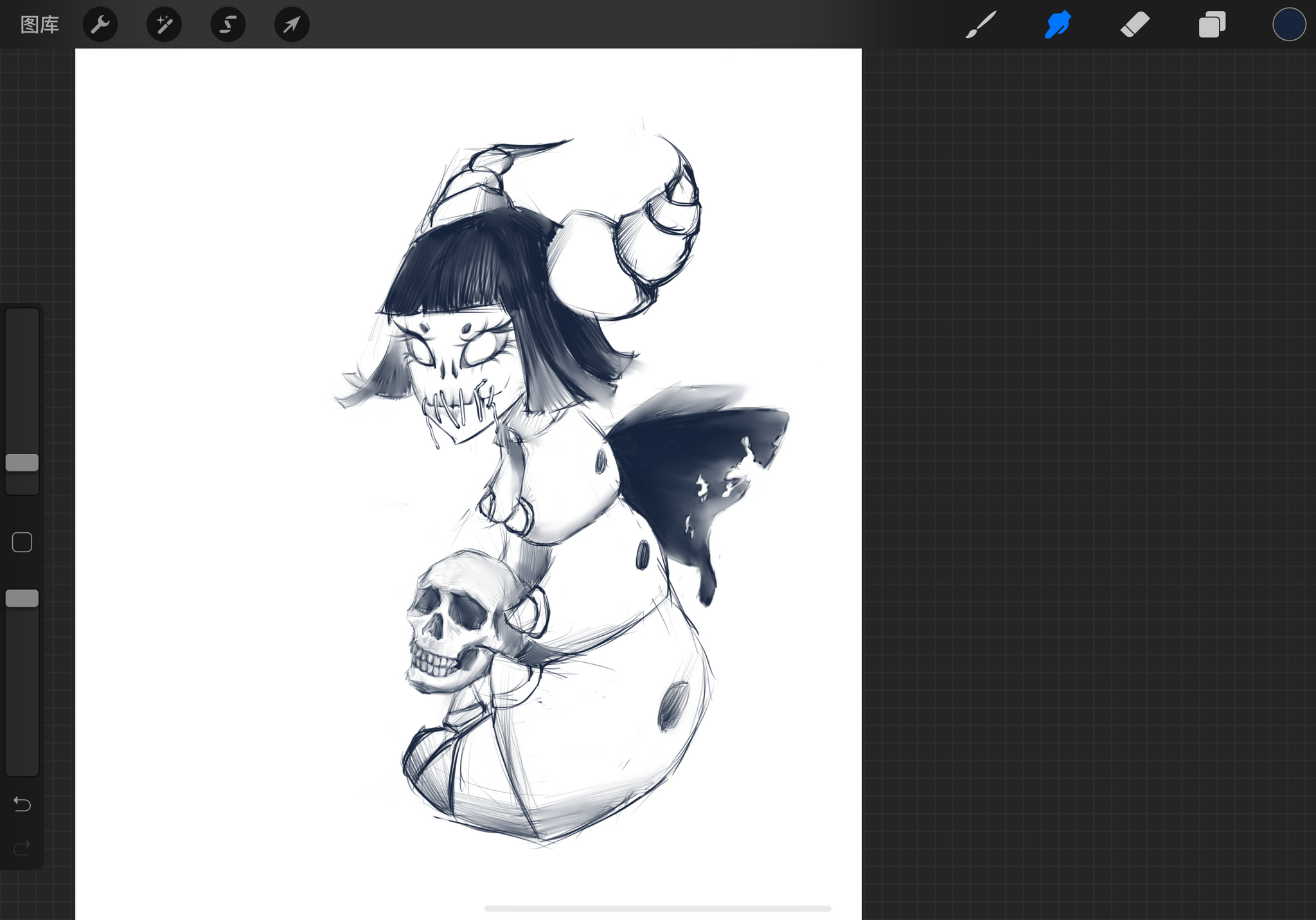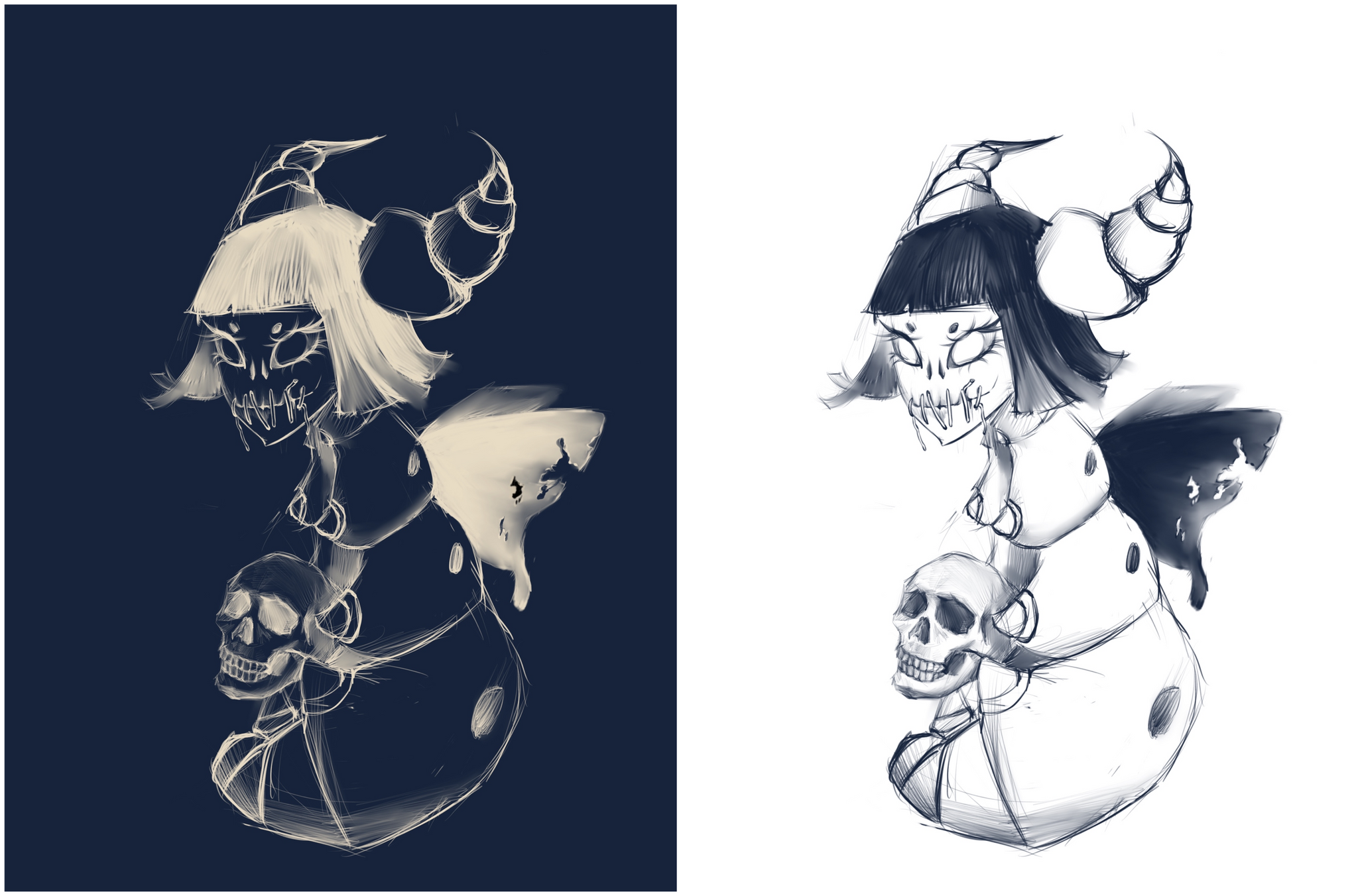 We can take that pretty face and “fix” it with some added lines, marks, and scars. A few lines around the eyes as we add details and this young girl is fitting rather nicely into what I had hoped to accomplish. I added some more details to the hair here as well, and shaded it to match what I am trying to accomplish. Perhaps you are wondering about the body and the triangles on her back. Surely you know these are going to be wings, but I don’t think they will be functioning wings. Maybe tattered and worn. This seems like a good place to add some darkness for this one. I’m going to make the wings black so the body can stay white. Hmm, maybe the hair will be black also. It’s an artists prerogative to change their mind, not all dark drawing has to be actually dark. The white and dark balance is what I am trying to capture here, so If I make her hair black, it will look something like this.